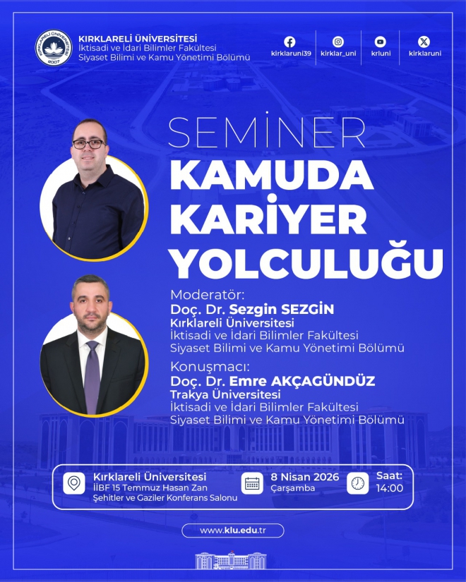 Öğrencilerimizin kamu sektörüne yönelik kariyer planlamalarına katkı sağlamak ve bu alanda farkındalık oluşturmak amacıyla Bölümümüzce “Kamuda Kariyer Yolculuğu” başlıklı seminer düzenlenecektir.